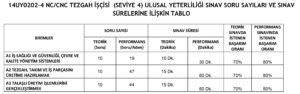 - Ulusal Yeterliliklerindeki birimlere ait teorik sınav soru sayıları ve sınav süresi aşağıdaki tabloda belirtilmiştir.
